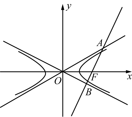 由双曲线的几何性质可得\(\angle AOF=\angle BOF\),在\(\triangle OAB\)中,由内角平分线定理得\(\dfrac{AF}{FB}=\dfrac{OA}{OB}\)